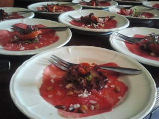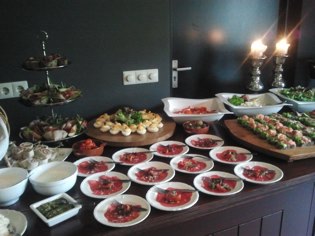 Warm & Koud buffet ARundvleessaladeKerriesalade Aardappelsalade met spekjes Boerensalade Gemengde salade Verse fruitsalade Huisgemaakte cocktai-l & knoflooksaus Gesorteerde Stokbroden met kruidenboter Kipfilet in zoetzure saus Gehaktballetjes in ketjapsaus In roomboter gebakken schnitseltjes Gemarineerde saté v/d haas met pindasaus Witte rijst met noten Gebakken aardappelen met spek/ui €18,00 Warm & Koud buffet BRundvleessaladeGerookte kipsalade met noten Aardappelsalade met spekjes Rauwkostsalade Gemengde salade Meloen met Parma ham Vers fruitsalade Huisgemaakte cocktail- & knoflooksaus Gesorteerde Stokbroden met kruidenboter Kipfilet in zoetzure saus Spare - ribs In roomboter gebakken schnitseltjes Gemarineerde saté v/d haas met pindasaus Witte rijst met noten Gebakken aardappelen met spek/ui Patat €22,00 Warm & Koud buffet CRundvleessaladeGerookte kipsalade met noten Zalmsalade Rauwkostsalade Gemengde salade Gerookte zalm, haring & makreel Rundercarpaccio Meloen met Parma ham Vers fruitsalade met gesneden vers fruit Huisgemaakte cocktail & knoflooksaus Gesorteerde Stokbroden met kruidenboter Kipfilet omwikkeld met spek Varkenshaasmedaillons in roomsaus In roomboter gebakken schnitseltjes Biefstukjes in pepersaus Zalm & Pangafilet met vissaus Gebakken aardappelen met spek/ui Patat €26,50 Tapasbuffet* Kaasplankje met o.a. diverse soorten kaasblokjes* Bruchetta’s (stokbroodjes met gerookte zalm, brie, geitenkaas, carpaccio, filet american, kruidenkaas * Spiesje van zongedroogde tomaat en gamba * Diverse soorten olijven & peppadews * Plateau met gesneden spaanse ham/worst * Pesto- en tomatentapenade * Italiaanse salade met feta kaas en zongedroogde tomaat * Tomatensalade met feta kaas & balsamico * Pasta tonijnsalade * Grote mand met diverse soorten olijvenbrood, foccacia & breekbroodjes * Kruidenboter, knoflooksaus & pomodori boter * Gamba-spiesjes met spek omwikkeld * Gegrilde chicken wings * Kipspiesjes met satesaus * Indische sate spiesjes van varkenshaas * Gefrituurde gamba’s €19,50 Barbecue AAmbachtelijke Twentse vleessaladeAardappelsalade met spekjes Rauwkostsalade van appel & ananas Gemengde salade met feta kaas American Coleslaw Cocktail & knoflooksaus Warme Satesaus & BBQ saus Stokbrood met Kruidenboter & sausjes Vlees: (4 stuks p.p.) BBQ worst, Gemarineerde karbonade, Gemarineerde kipfliet Satespiesje, Gemarineerde speklap €18,00 Barbecue BAmbachtelijke Twentse vleessaladeBoerenaardappelsalade met spekjes Rauwkostsalade van appel & ananas Gemengde salade met feta kaas American Coleslaw Verse Meloen Vers fruit salade Cocktail- & knoflooksaus Warme Satesaus & BBQ saus Stokbrood met Kruidenboter & sausjes Steakfrites Vlees: (5 stuks p.p.) Biefstukjes Gemarineerde kipfilet Sate v/d haas Gemarineerde speklap Hamburger Spare- ribs Shaslikspiesje €22,50 StamppottenbuffetBoerenkool met spekjesHutspot wortelen Zuurkool met ananas Augurkjes/zilverui, amsterdamse ui, mosterd Hachee (stoofschotel) Spare- ribs Braadworst Speklapjes Rookworst €18,00 HapjesbuffetBolletjes rundvleessalade gegarneerdBolletjes Zalmsalade gegarneerd Gevulde eieren Haringplateau met gesnipperde ui Plateau met diverse kaas borrelhapjes Gevulde wraps met zalm/roomkaas & kip-pesto Stokbroodjes belegd met o.a. brie/walnoot, zalm, filet american Vers afgebakken stokbrood met kruidenboter & knoflooksaus Warm: Kipsaté met pindasaus overgoten Gehaktballetjes in zoete pittige saus Gesneden beenham in roomsaus €16,00 Italiaans BuffetKoud: Italiaanse Salade met o.a. Parmezaanse kaas en een heerlijke dressingSalade Caprese (mozarella & tomaat) Vitello tonato Tonijn pastasalade Parmaham met meloen Ciabatta & Olijvenbroden met tomaten en pesto tapenade’s Pomodori kruidenboter Warm: diverse pasta’s o.a.: penne rigate, tagliatelle en fusilli Proscûito Carbonara (gegrilde ham in carbonara saus) Osso Bucco Lasagna Varkenshaas op Siciliaanse wijze Italiaanse visstoofschotel (zalm/broccoli/champignons/asperge) €23,50 Dranken arrangementOnbeperkt bier, fris, binnenlands gedistilleerd & wijnen (excl. buitenlands gedistilleerd).2 uur €14,50 p.p. 3 uur €18,50 p.p. 4 uur €22,50 p.p. Prijzen zijn per persoon & inclusief BTW vanaf 20 personen |